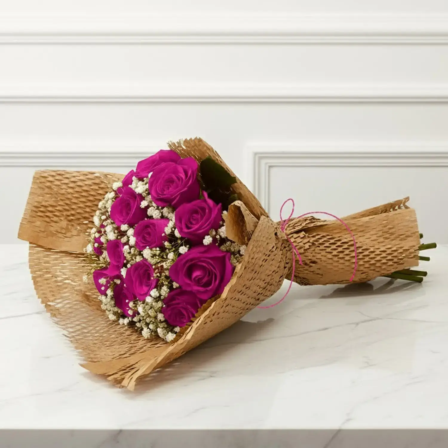 Composição: 20 rosas cor de rosa com Gypsophila e embalagem