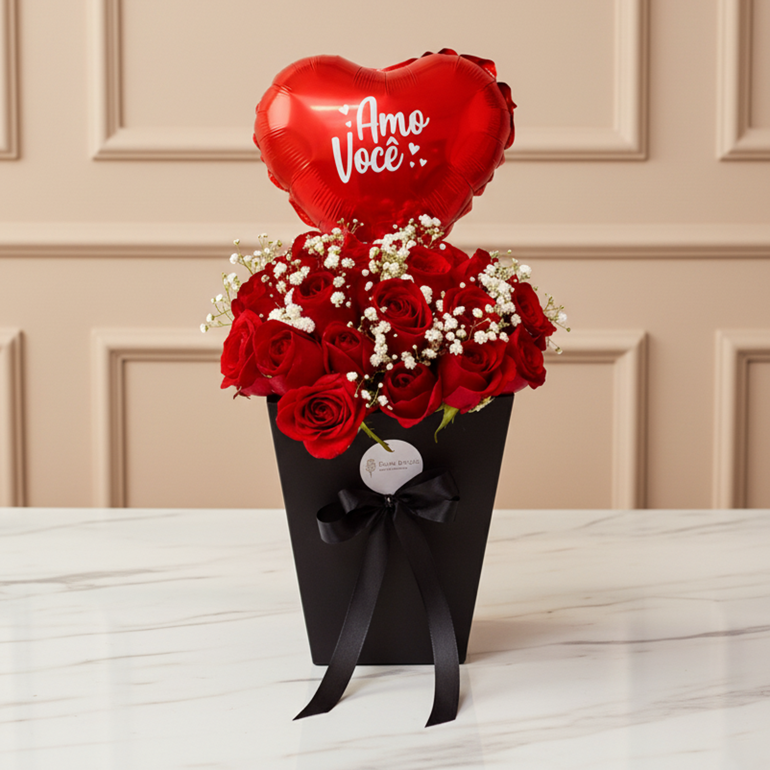 Composição: Caixa em formato de bolsa com rosas vermelhas e Mosquitinho