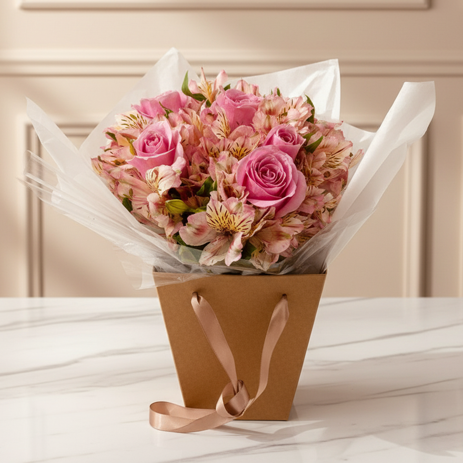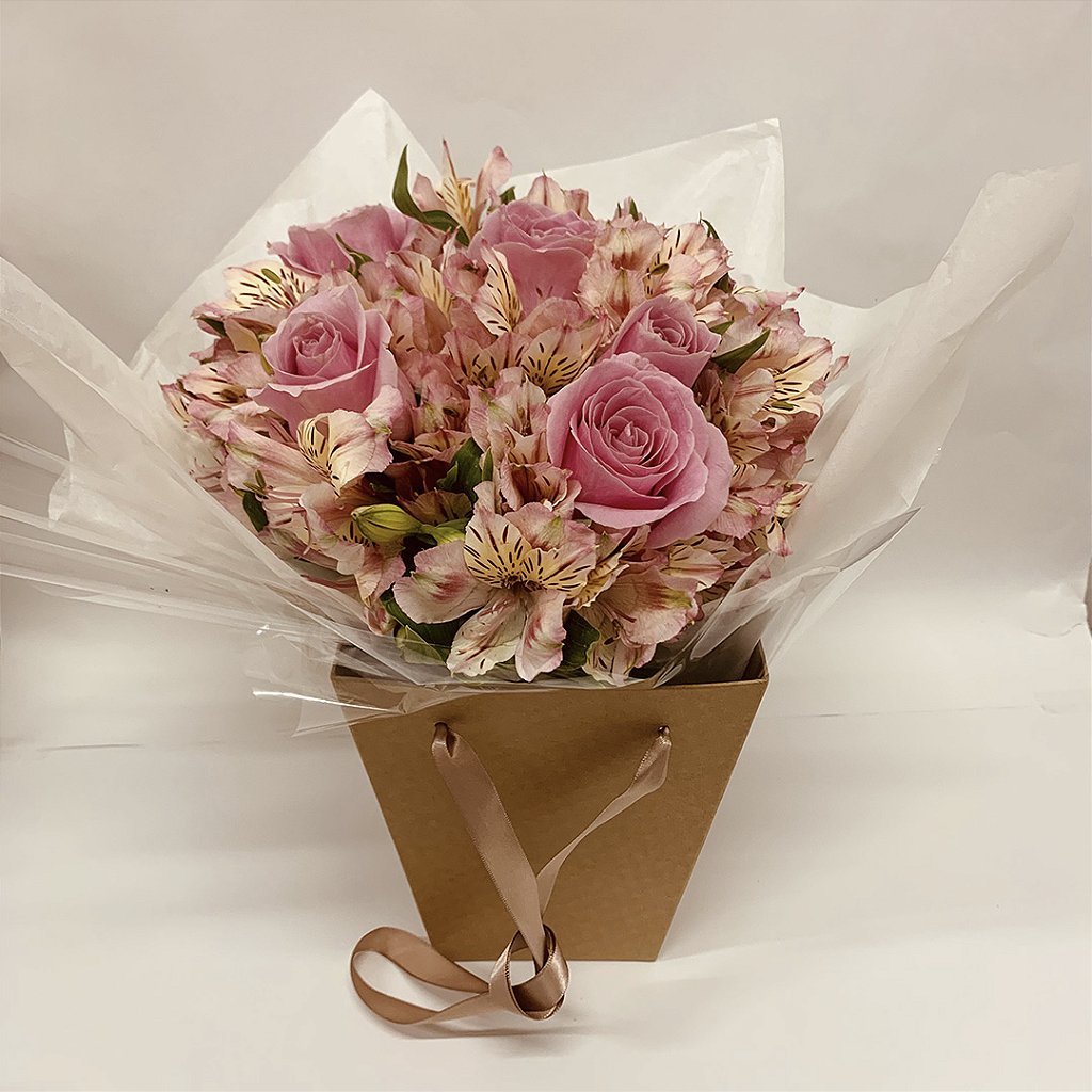 Composição: Caixa em formato de bolsa com 5 rosas cor de rosa e 10 alstroemerias cor de rosas