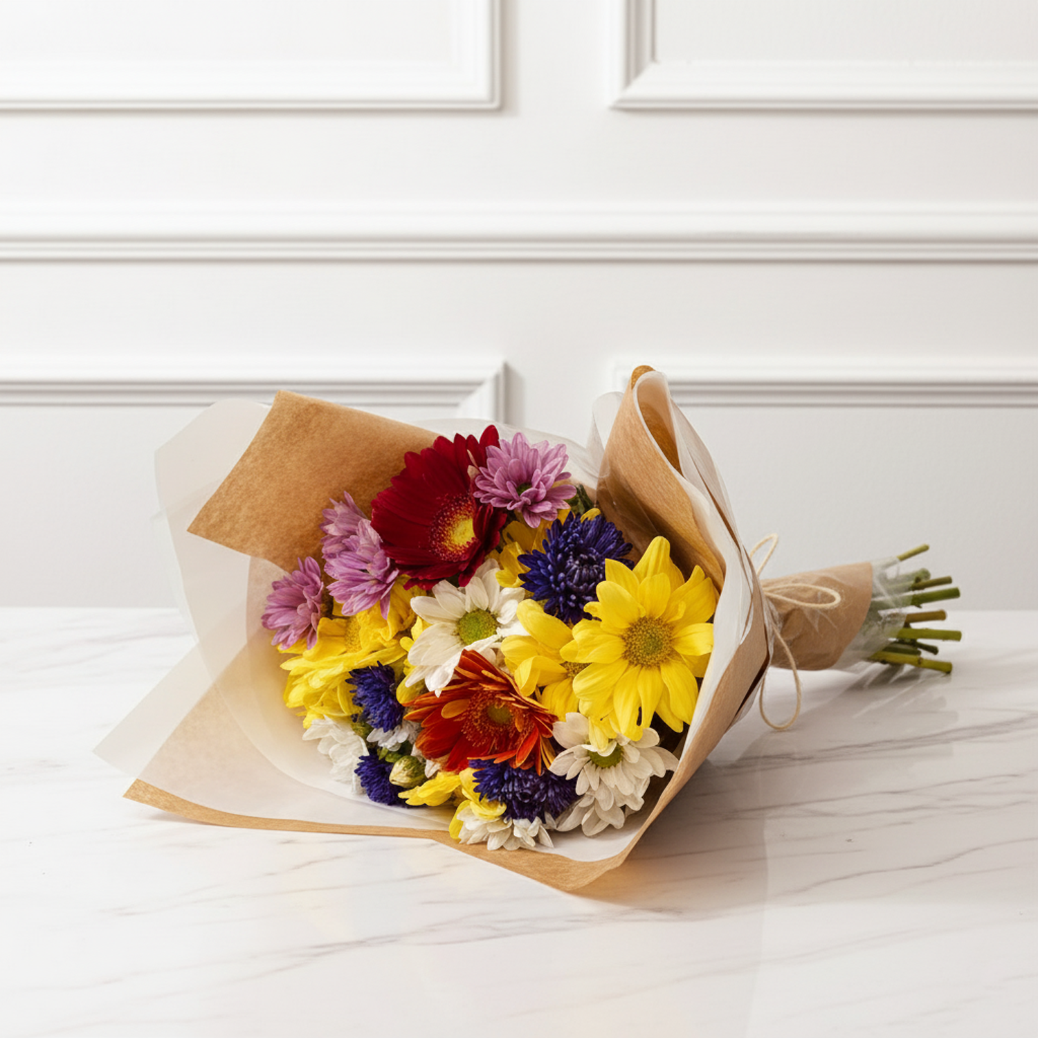 Cuidados: Assim que receber o buquê, retirar da embalagem cortar os caules na diagonal e colocar na agua. Trocar a agua a cada 2/ 3 dias, e cortar o caule na troca da agua.