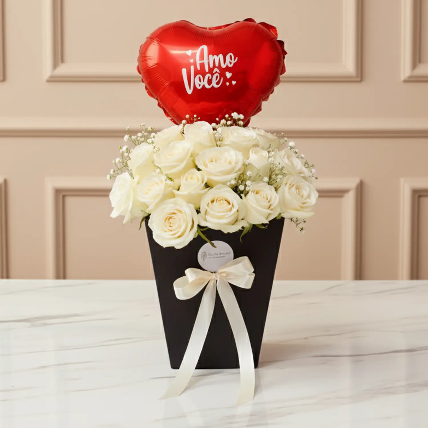 Composição: Caixa em formato de bolsa com rosas vermelhas e Mosquitinho