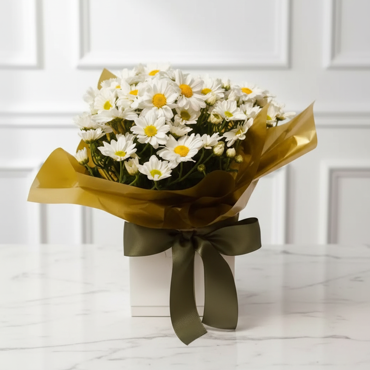 Você tem o poder de personalizar seu arranjo escolhendo a cor das margaridas: amarela ou branca. Seja para transmitir a alegria do sol com o brilho das margaridas amarelas ou a pureza e simplicidade das margaridas brancas, cada escolha é uma expressão única de carinho e afeto.