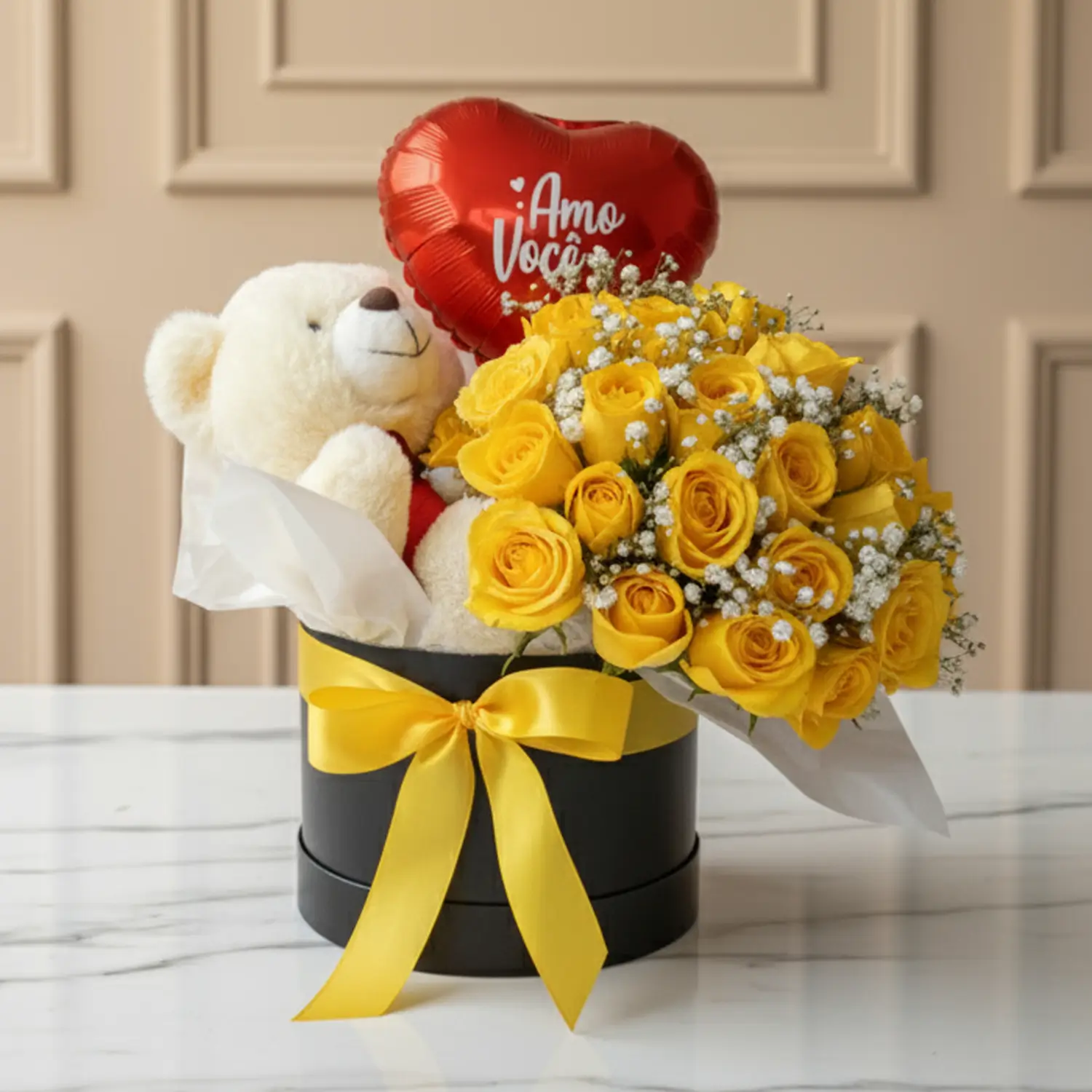 Box Luxuoso De Rosas Amarelas Com Ursinho E Balão