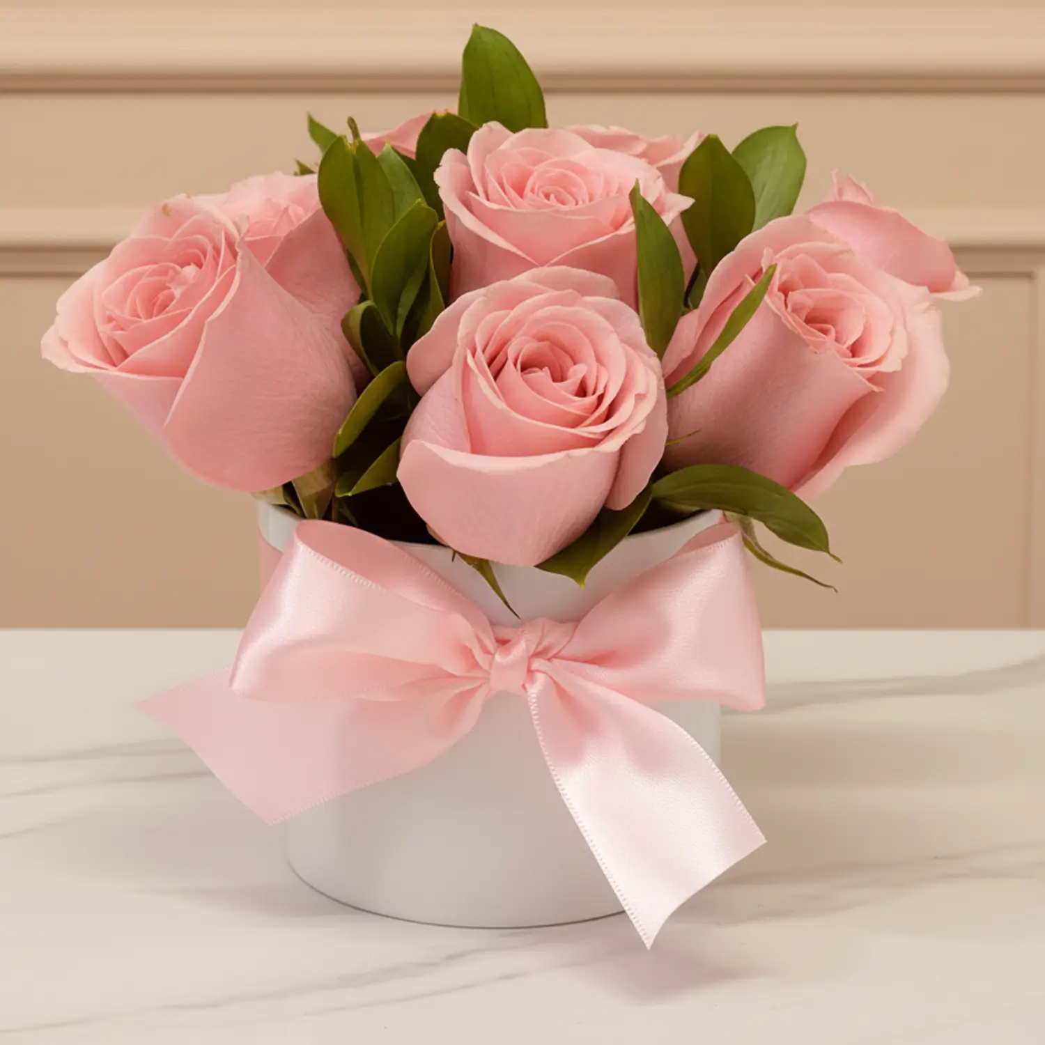 Composição: Box branco com 8 rosas vermelhas com folhagens