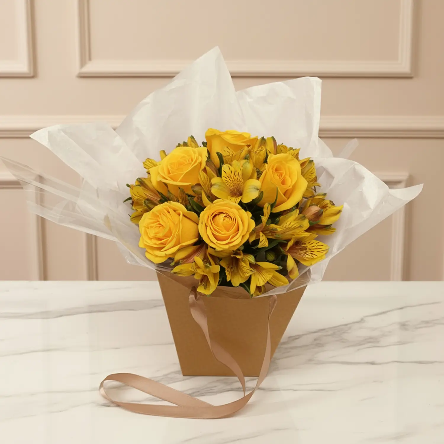 Buquê em Tons de Amarelo na Caixa em Formato de Bolsa